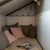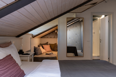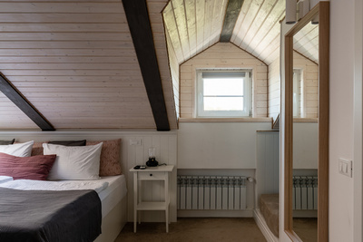 Изюминкой этого мансардного номера является ниша, которая очень нравится нашим маленьким гостям. Помимо ниши этот номер площадью 23 м² обладает всеми остальными атрибутами нашего места: двуспальной кроватью «king size» (180×200), шкафом для вещей и двумя мансардными окнами, одно из которых смотрит на Оптину Пустынь.